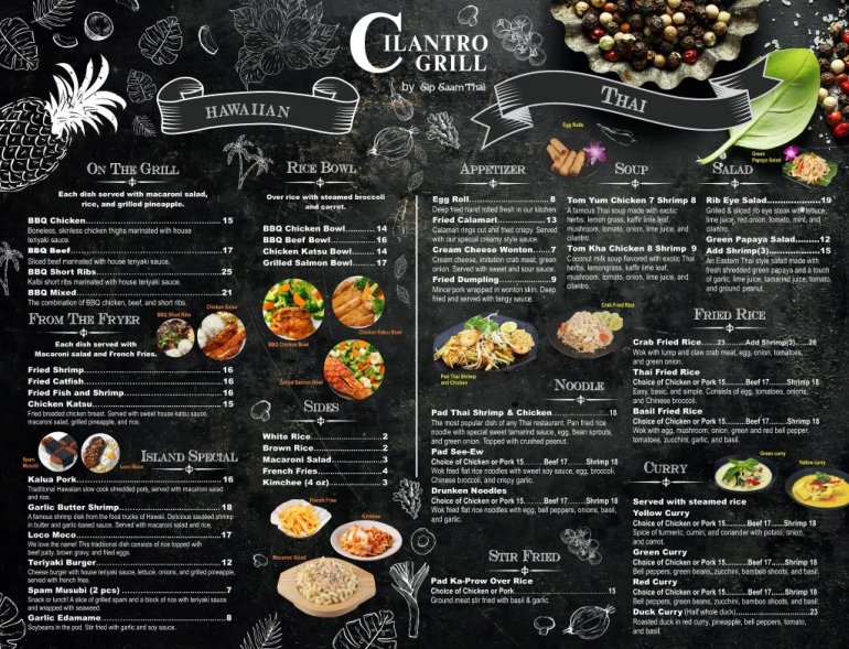 Cilantro Grill by Sip Saam Thai is now open at 325 N. Bell Blvd. in the building formerly occupied by El Pollo Rico and Mo’s Best Eatery. The new restaurant’s menu featured both Hawaiian and Thai specialties.